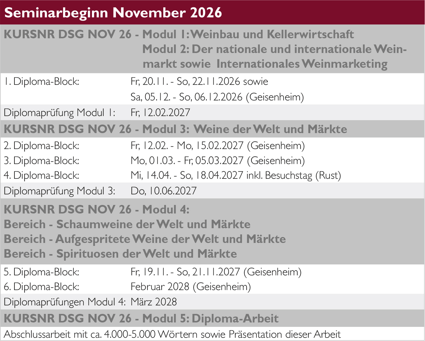 - Exklusiv für diesen Kurs findet der 4. Diploma-Block am Campus der Weinakademie Österreich in Rust statt. Eine Studienreise führt die Studenten in die Weinbaugebiete Österreichs und ist im Kurspreis inkludiert!
